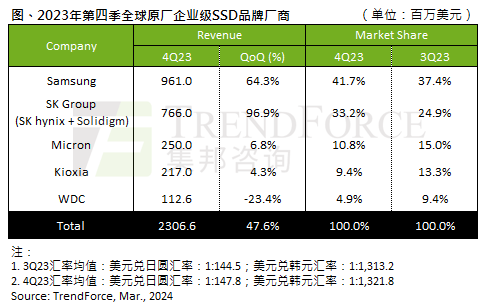据TrendForce集邦咨询3月7日研究显示,在2023年第四季度Enterprise SSD市场中,三星以41.7%的市占率占据全球第一,其次是SK集团(33.2%)、美光(10.8%)、铠侠(9.4%)、西部数据(4.9%)。