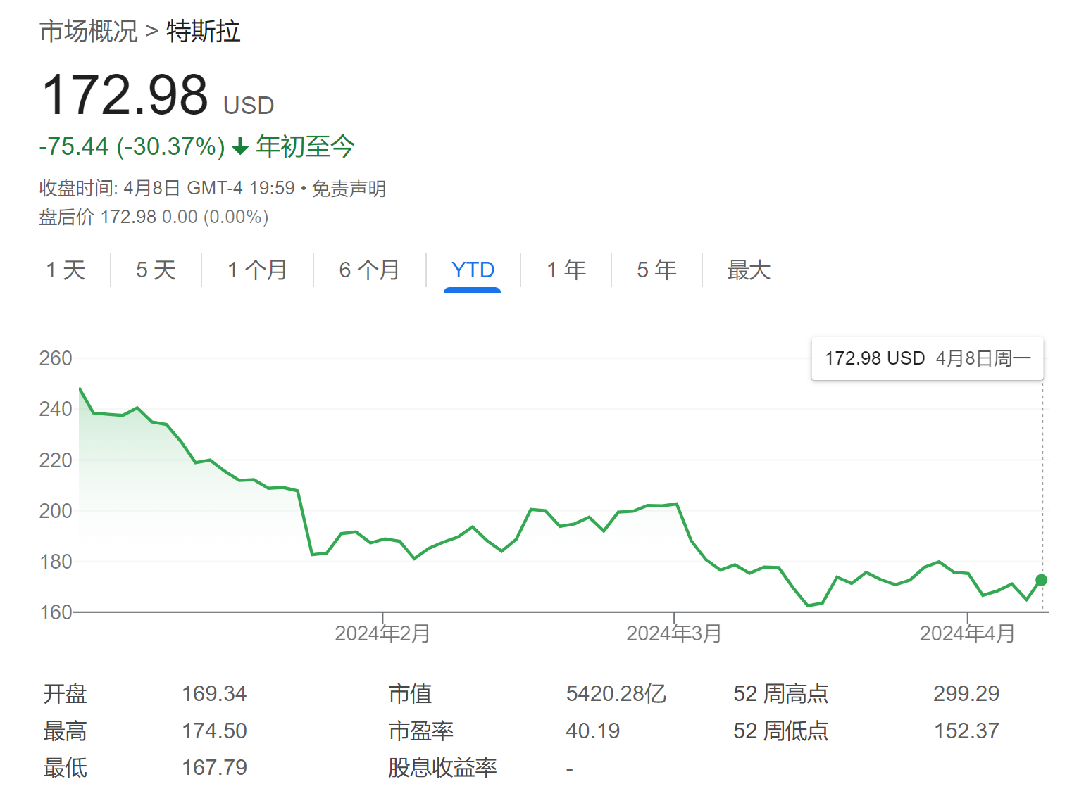上周五,马斯克放出“重磅消息”称,将在今年8月8日发布无人驾驶出租车(Robotaxi)产品。这显然是为了挽救特斯拉今年以来的颓势。事实上,在特斯拉4月2日公布疲软的季度交付数据之前,该公司的股价已经在下跌。几天后,又有媒体报道称,特斯拉已放弃低成本汽车计划,进一步加剧了其股价跌势。马斯克含糊的否认并没有起到什么提振作用。