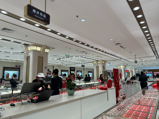 ▲(北京菜百总部,购买黄金首饰的人较春节前有所减少。图源/市界)