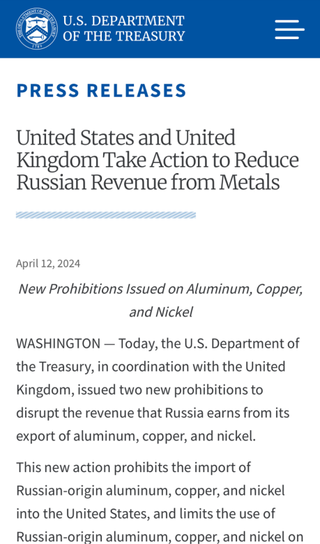 4月12日,美国和英国宣布对俄罗斯铝、铜和镍实施新的交易限制。新规定禁止伦敦金属交易所(LME)和芝加哥商业交易所(CME)接受俄罗斯新生产的金属,4月13日及之后生产的俄罗斯铝、铜和镍都属于被禁之列。