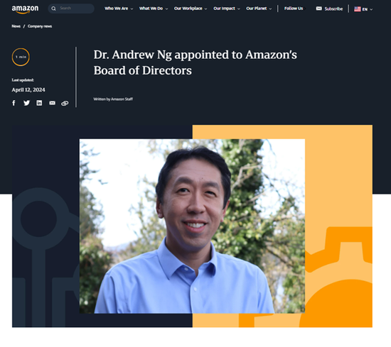 当地时间4月12日,亚马逊公司宣布,任命全球知名的人工智能学者吴恩达为董事会成员,相关任命已于4月9日生效。这是继3月底完成对AI公司Anthropic的40亿美元全部投资后,亚马逊加码AI的又一举措。