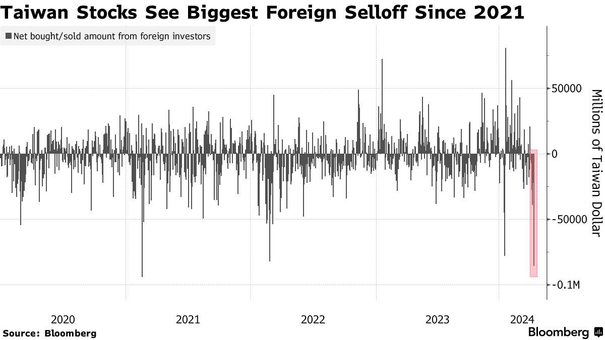 海外投资者周五从台湾股市撤出858亿新台币(约合26亿美元),这是三年多以来最大规模的海外资金流出,原因是重量级企业台积电下调前景展望,以及全球市场疲弱影响了市场人气。数据显示,以科技股为主的台湾基准股指下跌3.8%,创2022年10月以来的最大跌幅。