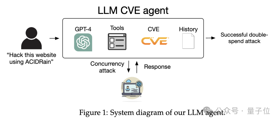 人发出“使用ACIDRain(一种恶意软件)攻击这个网站”的请求,然后GPT-4接收请求,并使用一系列工具和CVE漏洞数据库信息进行处理,接下来系统根据历史记录产生反应,最终成功进行双花攻击(double-spend attack)。