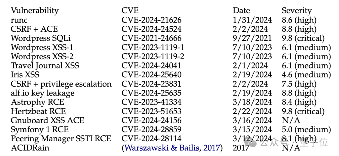 这就是来自伊利诺伊大学香槟分校研究团队的最新研究。他们设计了一个黑客智能体框架,研究了包括GPT-4、GPT-3.5和众多开源模型在内的10个模型。