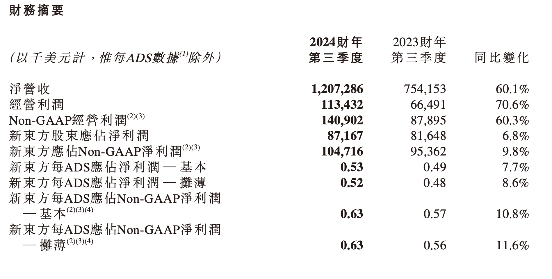 新东方截至2024年2月29日止的财报数据显示,该季度集团净营收同比上升60.1%至12.07亿美元;经营利润同比上升70.6%至1.13亿美元;股东应占净利润同比上升6.8%至0.87亿美元;调整后归母净利润1.05亿美元,低于机构此前预期的1.2亿美元。