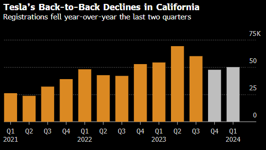 加州新车经销商协会(California New Car Dealers Association)的报告显示,特斯拉在加州的汽车销量连续第二个季度减少,表明该公司在该州的受欢迎程度可能已经达到顶峰。该行业组织周一表示,尽管特斯拉仍在加州畅销,但第一季度特斯拉的整体新车注册量同比下降7.8%。去年第四季度,特斯拉的注册量下滑9.8%。