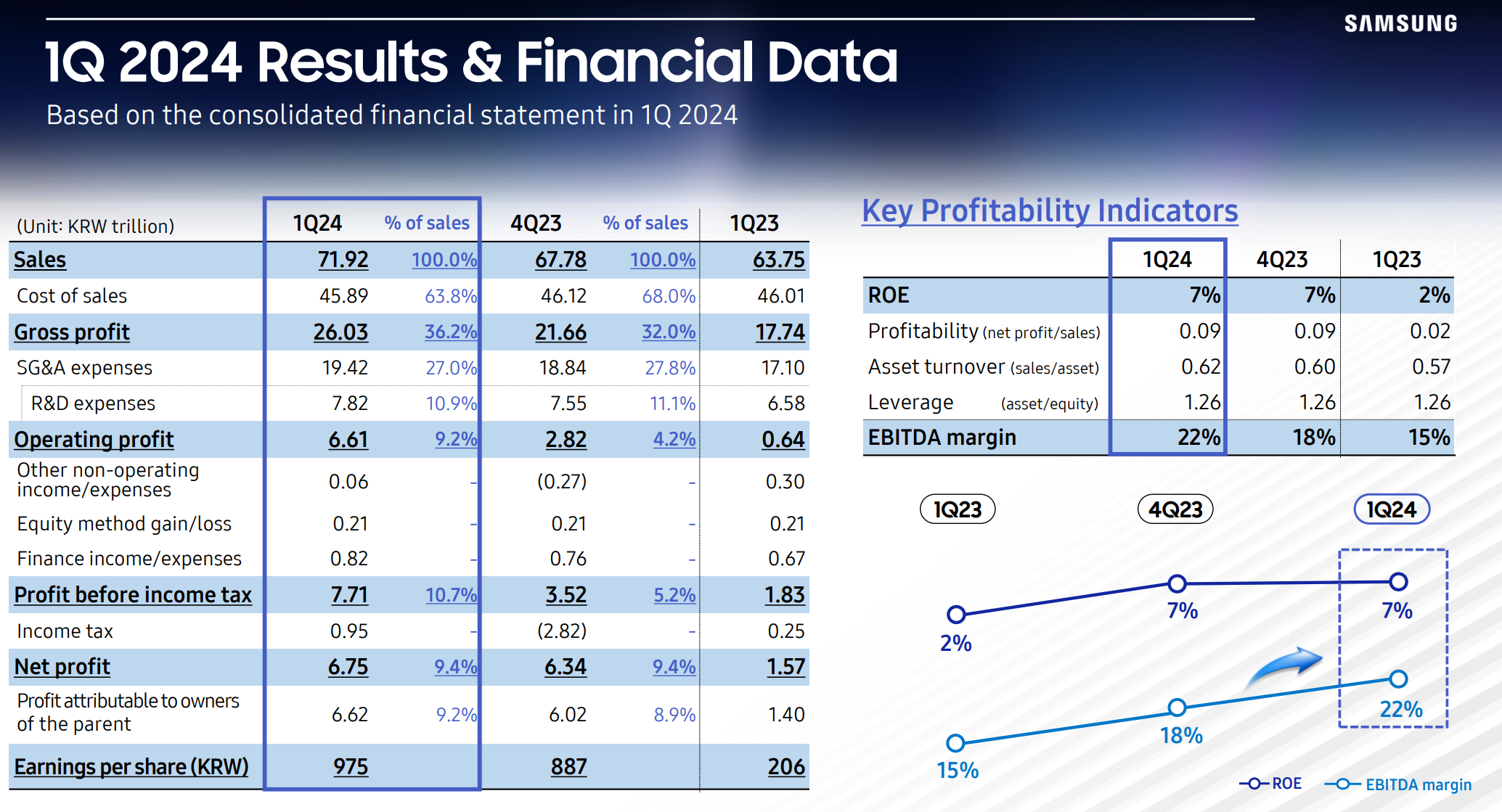 据报道,得益于人工智能(AI)热潮带来的广泛投资,三星电子的半导体业务自2022年以来首次恢复盈利,且在一季度利润激增。这家全球最大的存储芯片制造商发布最新财报称,Q1实现净利润6.62万亿韩元(48亿美元)。这高于分析师平均预测的5.63万亿韩元,是上年同期的四倍多。当季销售总额为71.92万亿韩元,其中芯片销售额为23.14万亿韩元,预估22.52万亿韩元。