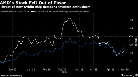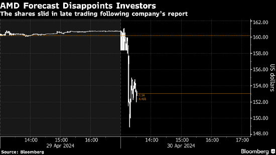芯片制造企业AMD盘后一度下跌9.1%,该公司对人工智能处理器的预测令市场失望。该公司预计,MI300系列芯片——所谓的人工智能加速器——今年将产生约40亿美元的收入,虽然高于之前预测的35亿美元,但一些分析师的最高期望值是80亿美元。