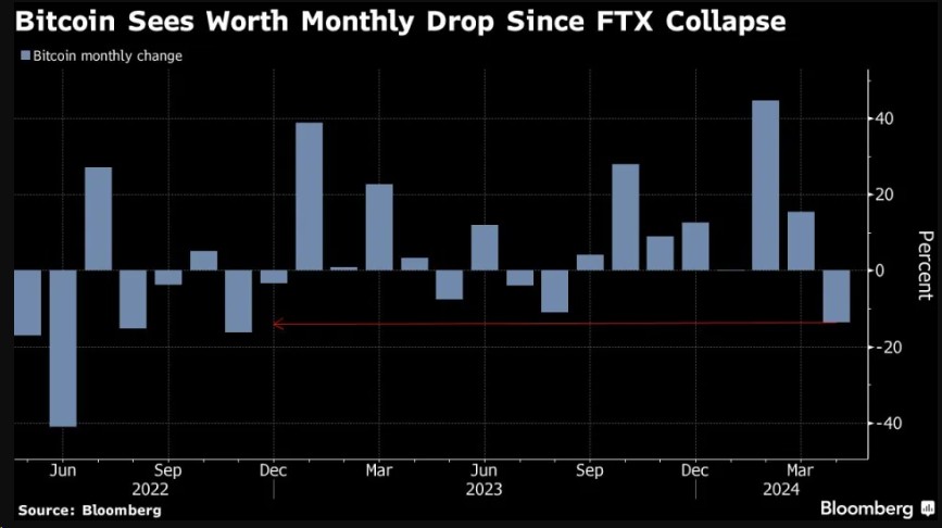 由于投资者对美国比特币ETF的需求降温,比特币遭遇了自山姆•班克曼-弗里德(Sam Bankman-Fried)的FTX帝国崩溃以来最大的月度跌幅。比特币在4月份下跌了近16%,仅略低于2022年11月的跌幅。美国ETF引发的狂热在3月份将比特币推至近7.4万美元的创纪录高点,但随着对美联储降息预期的减弱,对高风险投资的需求受到打击,流入比特币产品的资金已大幅减少。