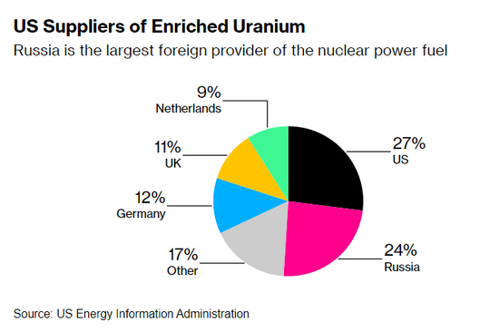 根据美国能源部数据,俄罗斯提供了美国超过90座商用反应堆所需浓缩铀的大约四分之一,使其成为美国最大的外国供应商。这些销售每年估计为俄罗斯带来约10亿美元的营收,但替代这部分供应可能面临挑战,并可能导致浓缩铀成本上升约20%。