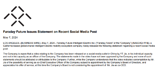 对此,法拉第未来发表声明称:“本公司知悉,贾跃亭以个人身份而非本公司高级管理人员的身份,在社交媒体上发布了一段与本公司有关的视频。视频中的陈述尚未得到本公司的批准,任何此类陈述都不应归因于本公司。”