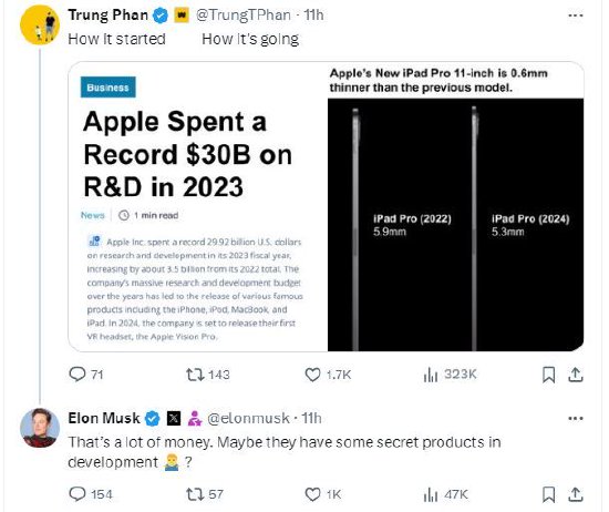 周二,苹果公司发布了新的iPad Air 6和iPad Pro产品,特斯拉CEO埃隆·马斯克对这家科技巨头的巨额研发投资提出了质疑。马斯克回应了X用户“Trung Phan ”的一条帖子,后者发布了一张截图,将苹果2023年高达300亿美元的研发支出与新款11英寸iPad Pro厚度的微小改进进行了比较,讽刺其巨额研发支出与成果不成比例。