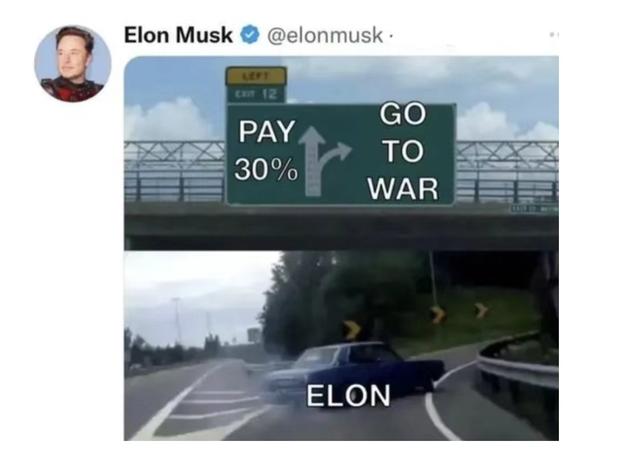 马斯克还发布了一张图片,路标显示了直走,支付30%和右转,开战两个选项,而图片中一辆代表马斯克的汽车正在急转向右。