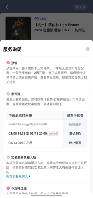 比如蔡依林5月18—19日的杭州演唱会仅开放了两轮退票,5月8日前退票免手续费,8日—13日退票收取20%手续费,13日后停止退票;徐佳莹5月25日北京演唱会则开放了三轮退票,退票手续费分为免费、30%和50%三档。
