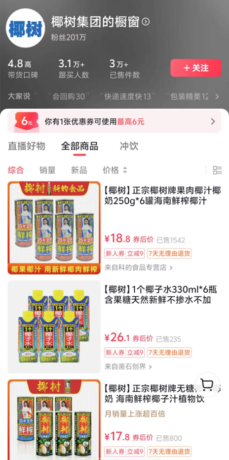 新浪科技注意到,无论是拥有430万粉丝的“椰树集团”还是80.3万粉丝的“椰树直播开心号”,这两大抖音橱窗的椰树椰汁、椰子油、凉茶、豆奶等产品,均未出现单品销量过万的产品,反而是因为拍椰树椰汁广告走红的模特“徐冬冬”,其抖音橱窗内的商品销量最高的一款达到38.8万。