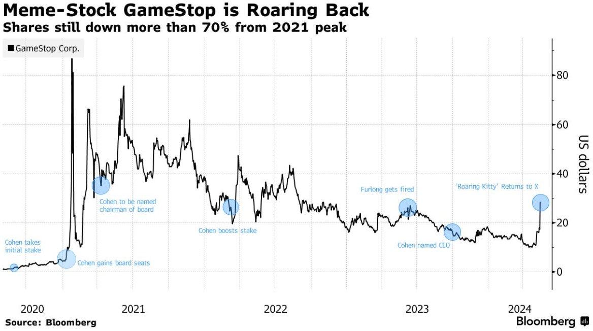 周一的买入是由Keith Gill在X周日晚上发布的一条帖子引发的。Gill是零售交易的偶像,绰号“Roaring Kitty”,在2021年6月从社交媒体上消失之前,他推动了最初的狂热。在不到一个小时的时间里,游戏驿站的市值增加了约60亿美元,因为交易员们认为Gill重返推特是繁荣回归的信号。曾经的MEME股宠儿AMC娱乐(AMC.US)上涨了80%以上。新上市的Reddit涨幅高达14%。在加密货币中,Roaring Kitty代币上涨了4000%以上。