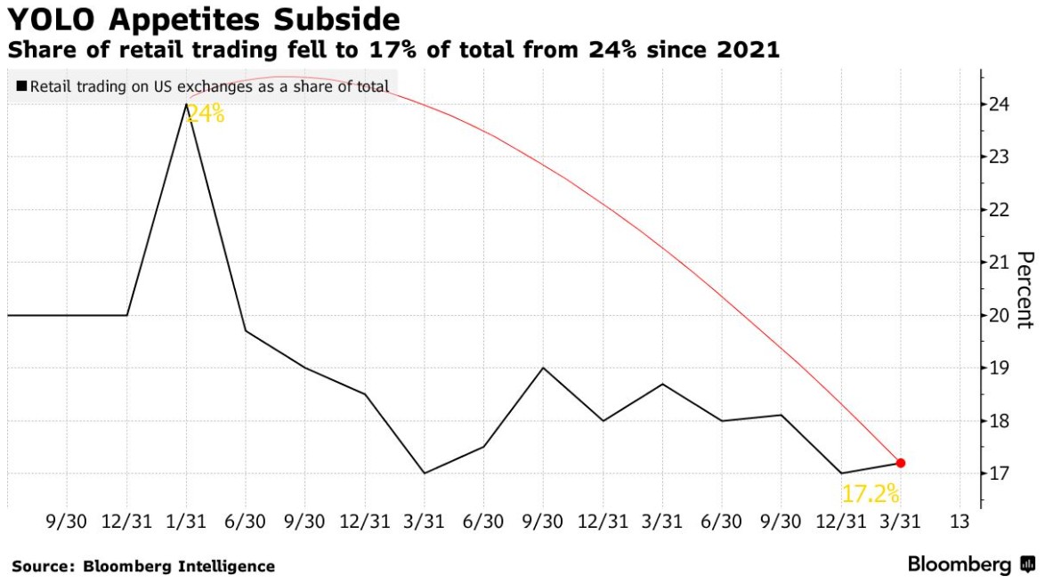 因此,尽管该组织周一的活动重新唤起了人们对2021年高峰的记忆,但它还没有到来。BI编制的估计数据显示,2021年第一季度,股票和ETF的散户交易订单占市场总成交量的24%。BI的数据显示,相比之下,2024年第一季度这一比例略高于17%。