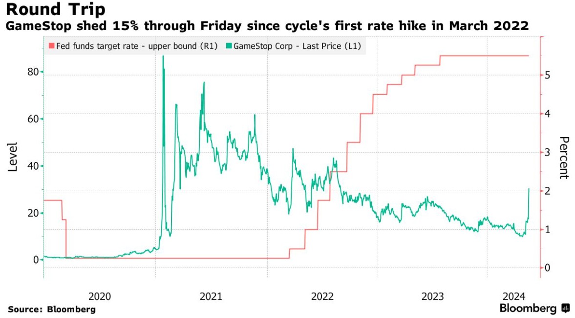 游戏驿站的上一个传奇故事在三年前成为焦点,之后美联储于2022年3月开始以一代人以来最快的速度加息,以冷却通胀。现在,股市和经济都处于一个不同的位置,散户交易员看到了命运的逆转,因为高借贷成本减少了他们在风险资产中的持有。