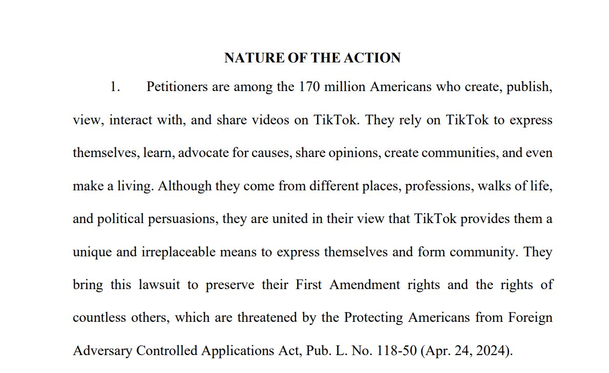 这些请愿者是1.7亿在TikTok上创作、发布、观看、互动和分享视频的美国人之一。他们依靠TikTok来表达自己、学习、倡导事业、分享观点、创建社区,甚至谋生。