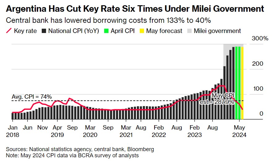 阿根廷在新任总统哈维尔•米莱(Javier Milei)任内第六次下调基准利率同时坚持缩减央行庞大的资产负债表规模,因为他所领导的政府认为通货膨胀率正在不断下降。阿根廷货币管理当局于当地时间周二在其网站上发布声明称,将基准利率从50%下调至40%。阿根廷基准的借贷成本已经从去年12月一度高达133%的历史高点显著回落。阿根廷4月CPI环比下降至8.8%,米莱认为未来会有更多积极进展。
