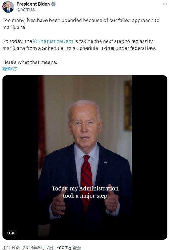 在司法部刊发文件后,美国总统拜登第一时间发布短视频强调,对大麻重新分类的政策,是在他的要求下,卫生部和司法部展开研究并最终提出了重新分级的建议。