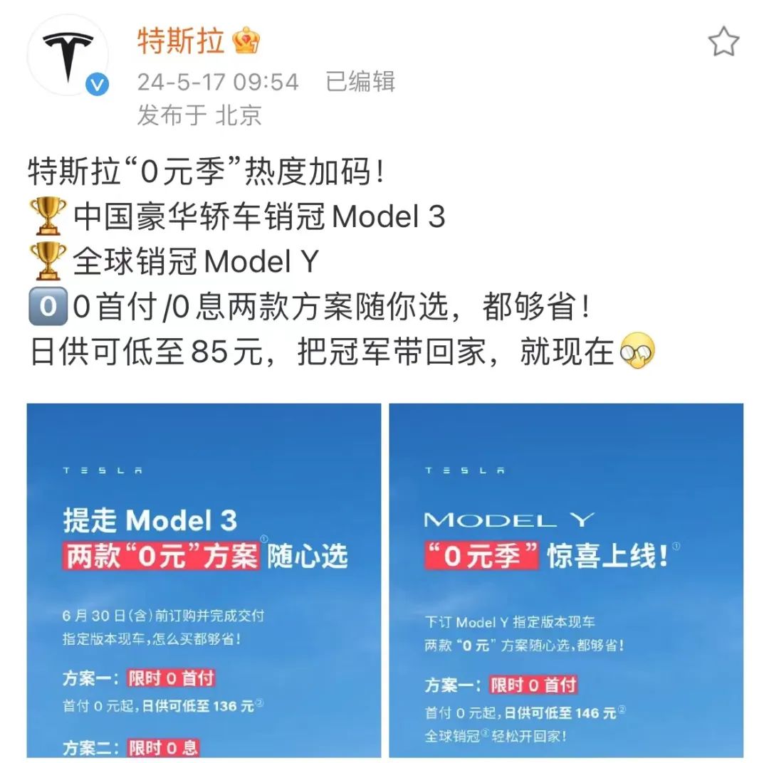 5月17日,特斯拉中国宣布推出Model 3和Model Y的0首付/0息活动,两款方案可选其一。