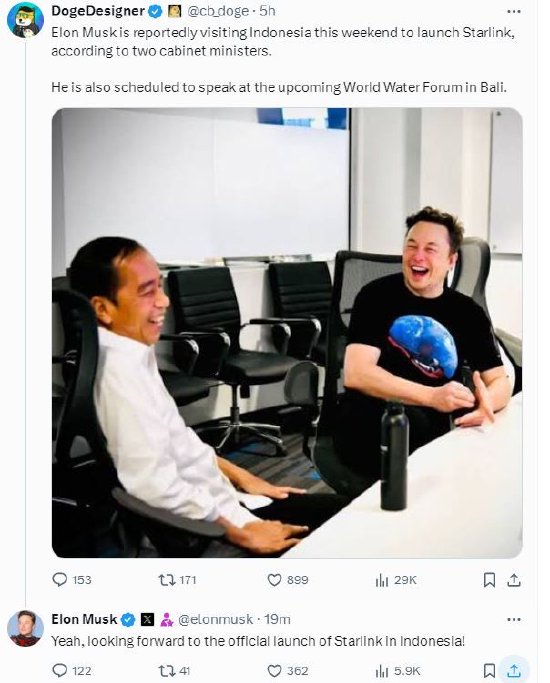 马斯克的一位粉丝在X上分享消息称,据两名印尼内阁部长透露,埃隆·马斯克本周末将访问印尼,启动星链。他还计划在即将在巴厘岛举行的世界水论坛上发表讲话。马斯克回应称:“是的,期待星链在印尼的正式启动!”