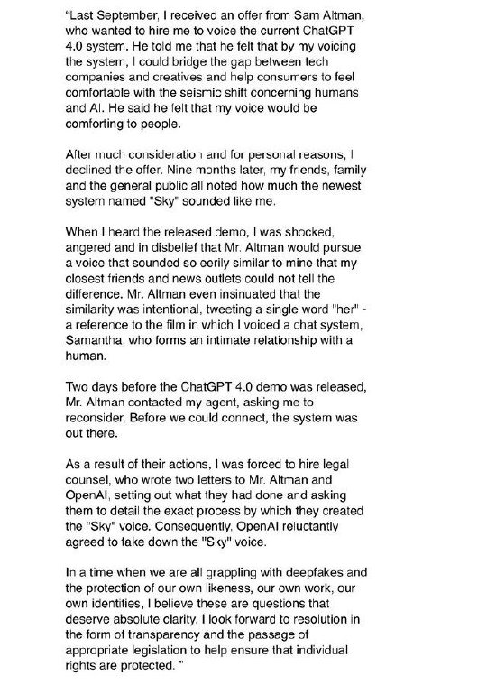 这位影星表示:“当我听到发布的小样时,我感到震惊、愤怒,不敢相信奥特曼会追求一种听起来与我的声音如此相似的声音,我最亲密的朋友和新闻媒体都看不出有什么不同。”
