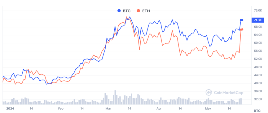 随着美国通胀势头减弱,降息预期不断上升,黄金、白银等贵金属价格近日不断升高。另一方面,加密货币市场也趁势反弹,最大加密货币比特币重新涨到70000美元以上。在3月中旬创下历史新高后,比特币表现一直疲软,在5月初因美国通胀形势生变,美联储降息前景惨淡而一度曾跌下60000美元。但随着局势改变,其正在收复失地。