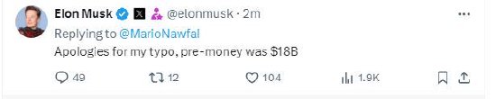 不过,马斯克稍后又发帖进行了更正:“为我打错字道歉,投前估值是180亿美元。”