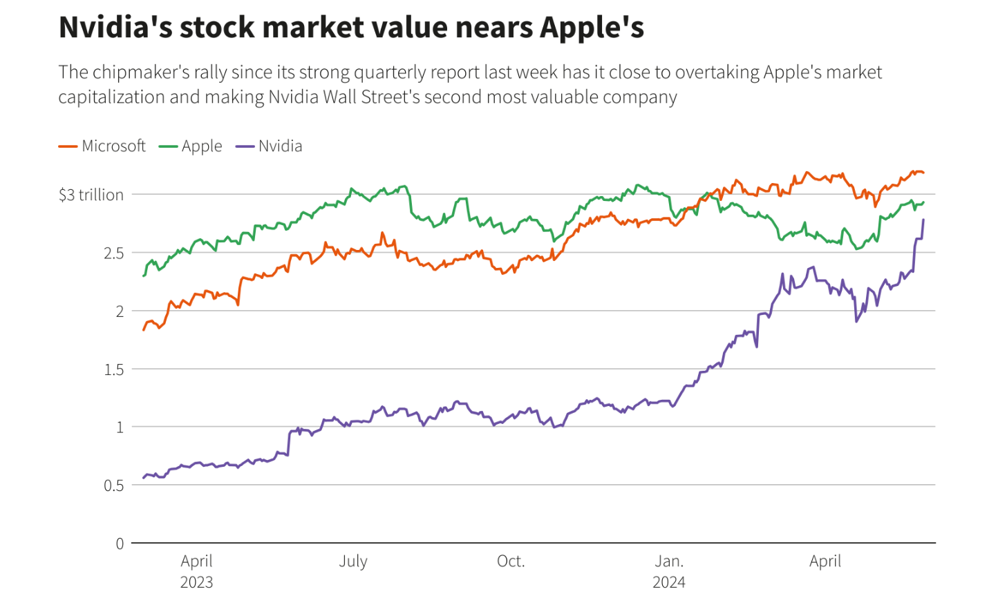 近日,“AI龙头”英伟达又开启了狂飙模式。截至周二美股收盘,该股大涨超7%,创下历史新高,市值达到约2.8万亿美元,较苹果仅差1000亿美元。英伟达的强劲财报给投资者留下了深刻的印象,使其轻松实现了“三连涨”,三日累计涨幅约20%。在英伟达的带动下,纳指也连续第三个交易日创收盘历史新高。