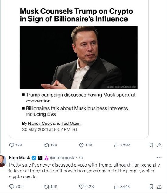 针对有关他曾和特朗普讨论加密货币的报道,马斯克在X上回应称:“我很确定我从未与特朗普讨论过加密货币。”