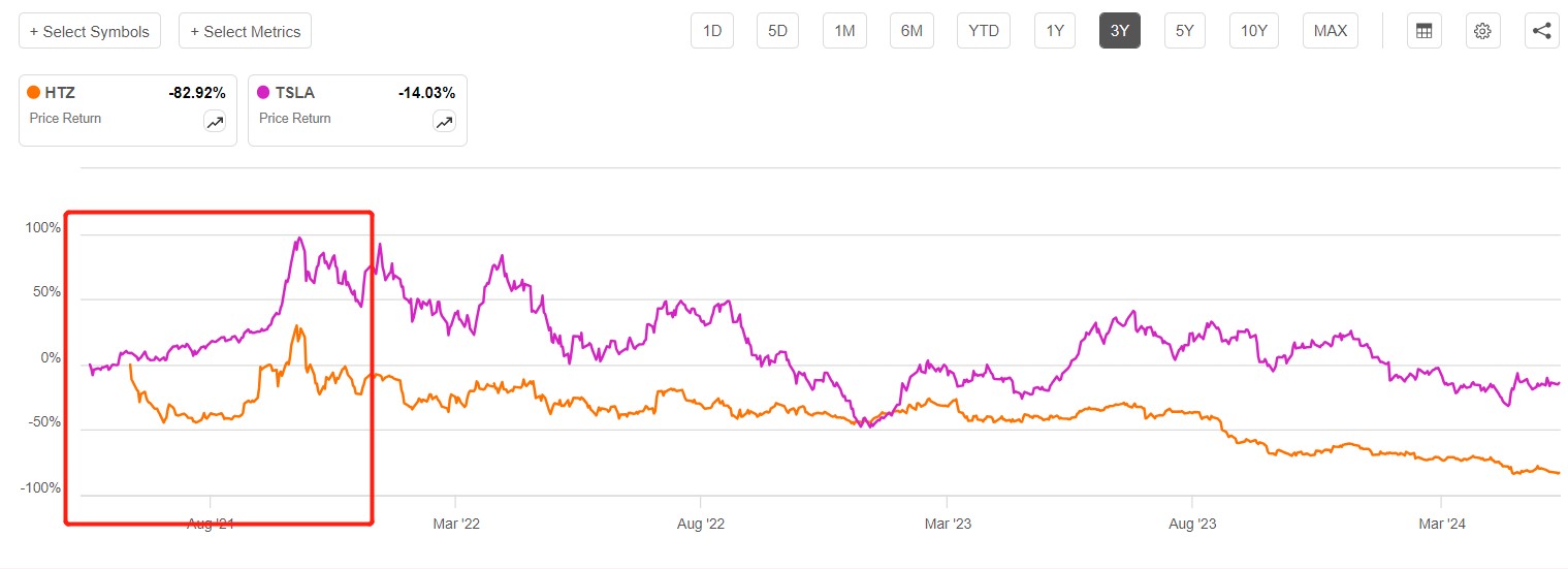 作为对比,在特斯拉电动汽车全球需求最辉煌的时期,赫兹股价也跟随特斯拉股价而一路走高,赫兹曾在2021年11月触及46美元这一历史峰值,如今股价徘徊在4.6美元附近。