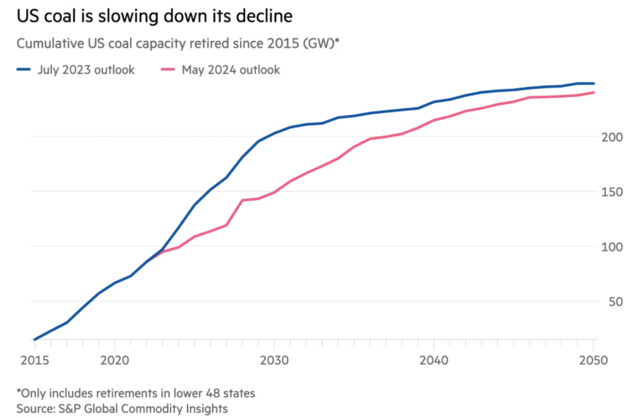 S&P Global Commodity Insights预计,到本十年末,美国将有54千兆瓦的煤炭发电资产退役,约占总发电能力的4%,这一预估比去年下调了40%,原因是对电网可靠性的担忧。