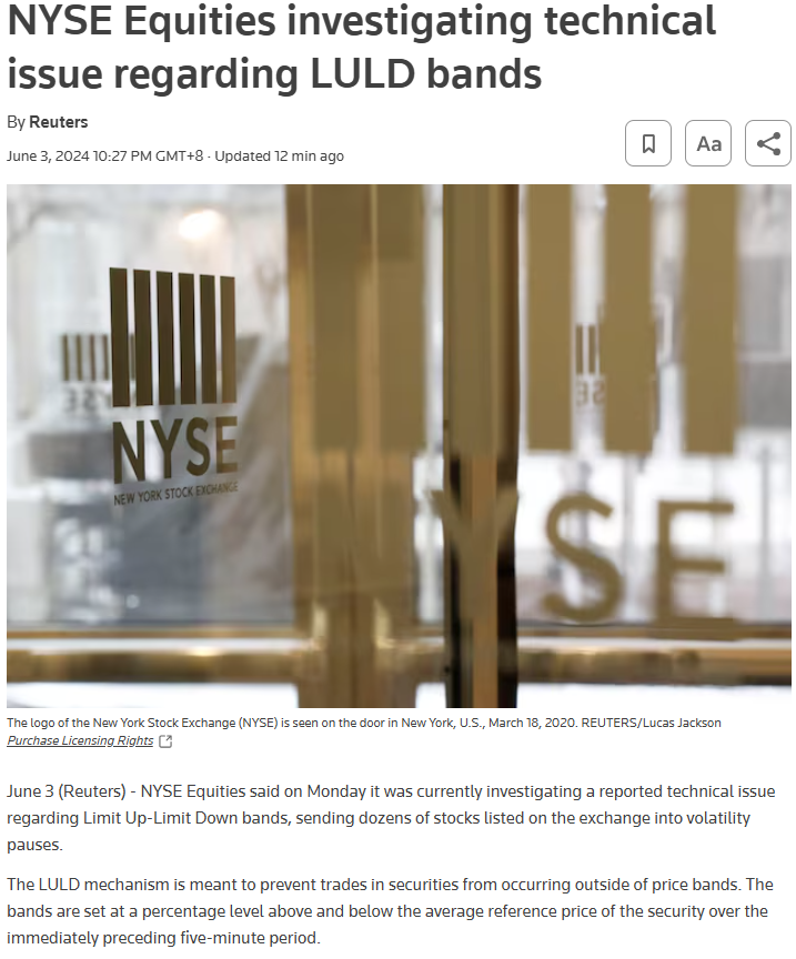 6月3日晚间,3只美股疑似出现行情异常,伯克希尔哈撒韦跌99.97%,报185.10美元。此外,巴里克黄金跌98.54%,报0.25美元;NUSCALE POWER跌98.51%,报0.13美元。对此,纽约证券交易所称,目前正在调查一起有关限涨限跌波段的技术问题,该问题导致数十只在纽约证券交易所上市的股票停牌,将尽快提供更多信息。