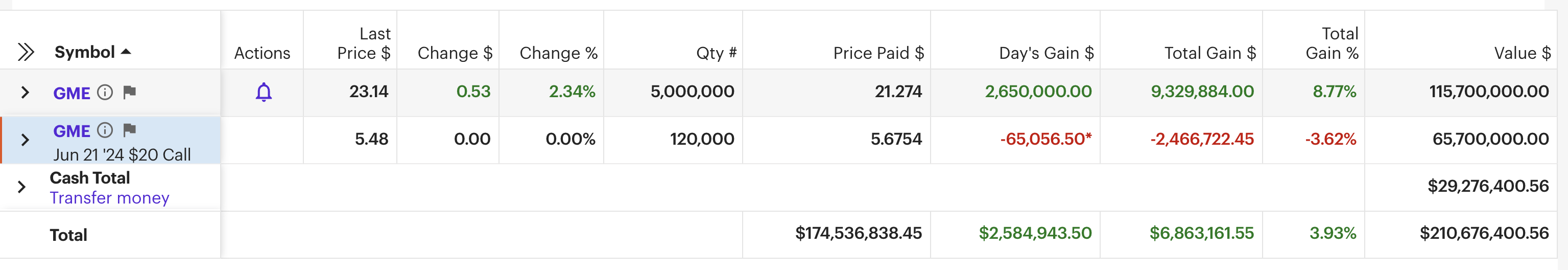截图显示,他已经以每股21.27美元的价格买入了500万股游戏驿站的股票,总价值高达1.157亿美元。此外,他还买入了12万份行权价为20美元、将于6月21日到期的看涨期权,这些期权的总价值约为6570万美元。