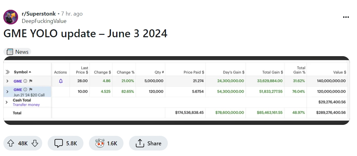 上月,美股散户的“带头大哥”Keith Gill重返社交媒体,用一张表情包预先暗示自己的回归。而周日,Keith Gill在其Reddit的账号“DeepF-Value”上,晒出了一张交割单截图。