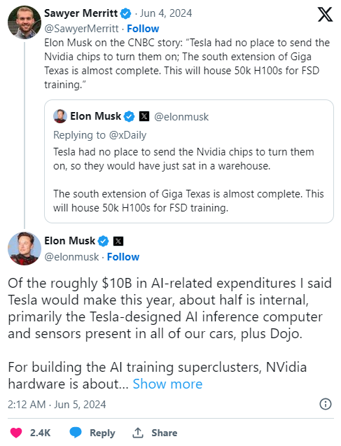 “特斯拉没有合适的场所来激活那些英伟达芯片,所以它们只会闲置在仓库里,德克萨斯州Giga工厂的南部扩建工程接近竣工,这里将部署5万台H100芯片,用于全自动驾驶(FSD)的训练。”“在我之前提到的特斯拉今年将进行的大约100亿美元AI相关支出中,大约有一半是用于内部,主要包括特斯拉设计的AI推理计算机、我们所有车辆中配备的传感器以及Dojo超级计算机。英伟达的硬件成本约占总成本的三分之二。”
