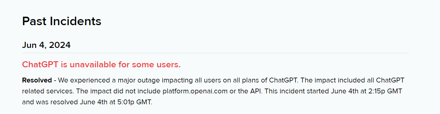 “我们经历了一次影响ChatGPT所有用户的重大中断。影响包括所有与ChatGPT相关的服务。受影响的不包括platform.openai.com或API。该事件始于格林尼治标准时间6月4日下午2:15(北京时间6月4日22:15),并于格林尼治标准时间6月4日下午5:01(北京时间6月5日凌晨1:01)解决。”