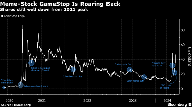 Gill助推了GameStop近期的巨幅动荡。自从他在5月12日以一个神秘表情包回归社交媒体平台X以来,该股飙升167%,市值也暴增110亿美元。