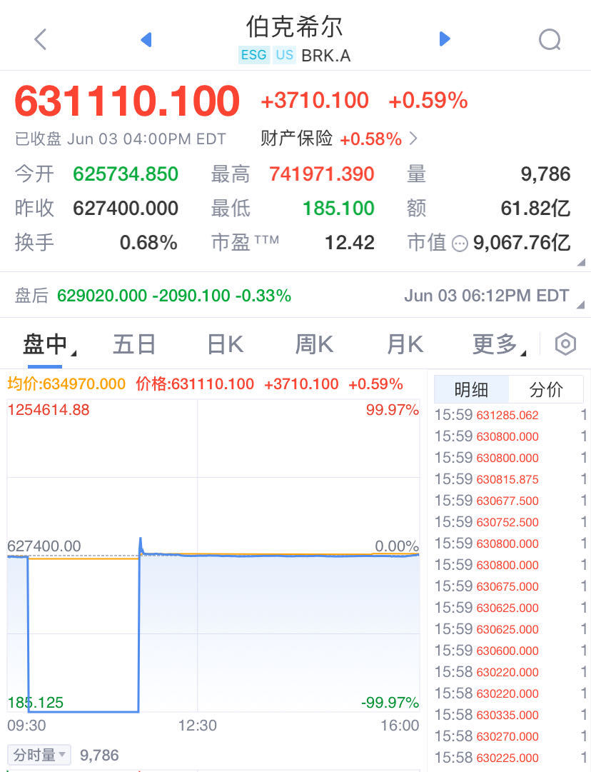 当日开盘不久,“股神”巴菲特旗下投资公司伯克希尔-哈撒韦公司的A类股票突然从前一个交易日收盘价的62万美元跌至185.1美元,价值几乎归零,激发了众多投资者“抄底”巴菲特的热情。