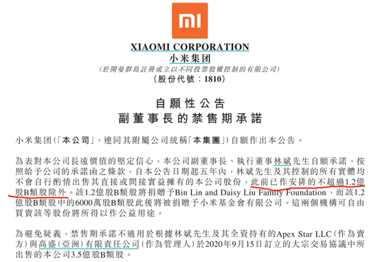 不过,这封承诺函中还提到:“此前已作安排的不超过1.2亿股B类股除外,该1.2亿股将捐赠予BinLin and Daisy Liu Family Foundation(林斌家族基金),该1.2亿股中的6000万股将被捐赠予小米基金会。这两个机构可自由买卖该股份将所得用作公益。”