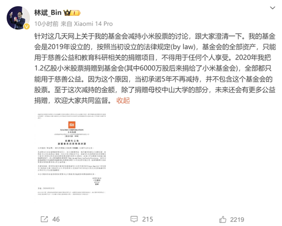 不过,林斌于6月22日早5时在个人微博上进行了回应,称“2020年,我把1.2亿股小米股票捐赠到基金会(其中6000万股后来捐给了小米基金会),全部都只能用于慈善公益。因为这个原因,当初承诺5年不再减持,并不包含这个基金会的股票。”林斌还称,这次减持的金额,除了中山大学的部分,还会有更多公益捐赠。