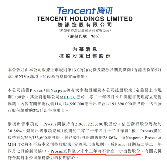 2021年,Prosus出售腾讯约2%股份,并称未来三年不会进一步出售。然而仅过了一年,Naspers集团就又选择减持腾讯,以筹集回购自身股票的资金。该消息一度导致腾讯股价跳水。