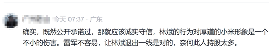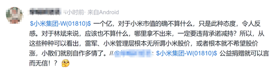 关键问题是,林斌2020年曾对外作出承诺,五年内不会自行出售直接或间接持有的小米股份。有投资者认为,林斌此时减持属于违背承诺,公益捐赠也不能建立在言而无信的前提上。更有声音称,此举是对小米形象的伤害,反映“雷军、小米管理层根本无所谓小米股价”。
