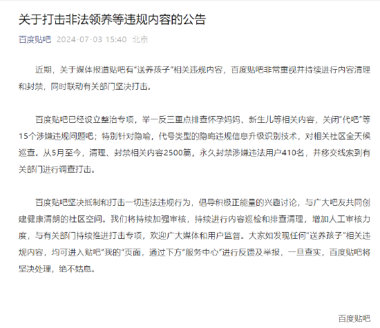 据公告内容,百度贴吧已经设立整治专项,举一反三重点排查怀孕妈妈、新生儿等相关内容,关闭“代吧”等15个涉嫌违规问题吧;特别针对隐喻,代号类型的隐晦违规信息升级识别技术,对相关社区全天候巡查。从5月至今,清理、封禁相关内容2500篇,永久封禁涉嫌违法用户410名,并移交线索到有关部门进行调查打击。