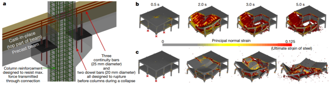 基于层级结构的倒塌隔离设计(a、基于分层优化的梁柱连接;b、基于层级结构的建筑部分倒塌隔离模拟;c、常规建筑倒塌场景模拟)图片来源:参考文献 1