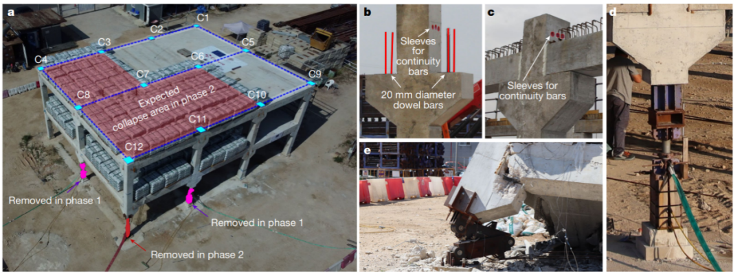 建筑设计和测试(a、在不同测试阶段拆除的全尺寸预制混凝土和柱结构;b、施工过程中的一层连接;c、施工中预制梁放置后的二层连接;d、在第一阶段测试中用于准静态去除的两柱装置;e、角柱拆除采用的三铰机制)图片来源:参考文献 1