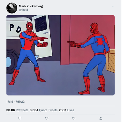 遭到突袭的马斯克一边在推特上继续羞辱嘲讽扎克伯格,一边安排推特起诉Instagram聘用被裁员的推特员工开发产品,侵犯了自己的技术专利。而扎克伯格也启用了荒废十多年的推特账号,只发了一张《蜘蛛侠对蜘蛛侠》的图片,似乎是对马斯克的无声嘲讽。