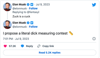 Threads发布的大背景,是扎克伯格和马斯克的个人恩怨激化。众所周知,马斯克是一个说话无所顾忌的商业领袖,常年不定期嘲讽贝索斯、盖茨等超级富豪,而扎克伯格则是他最瞧不上的硅谷精英,没有之一。